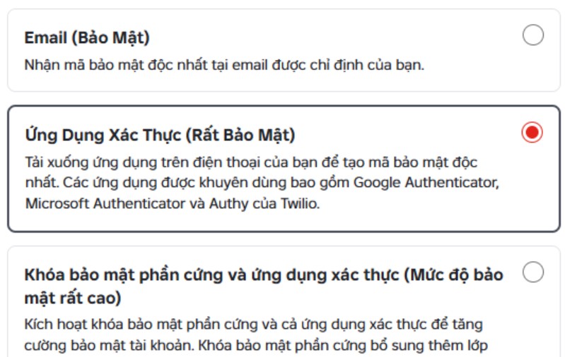 🛡️ Security Keys: Sử dụng các thiết bị phần cứng như khóa bảo mật. Đây là cấp độ bảo mật cao nhất, thường dành cho những tài khoản có giá trị hàng chục triệu đồng.